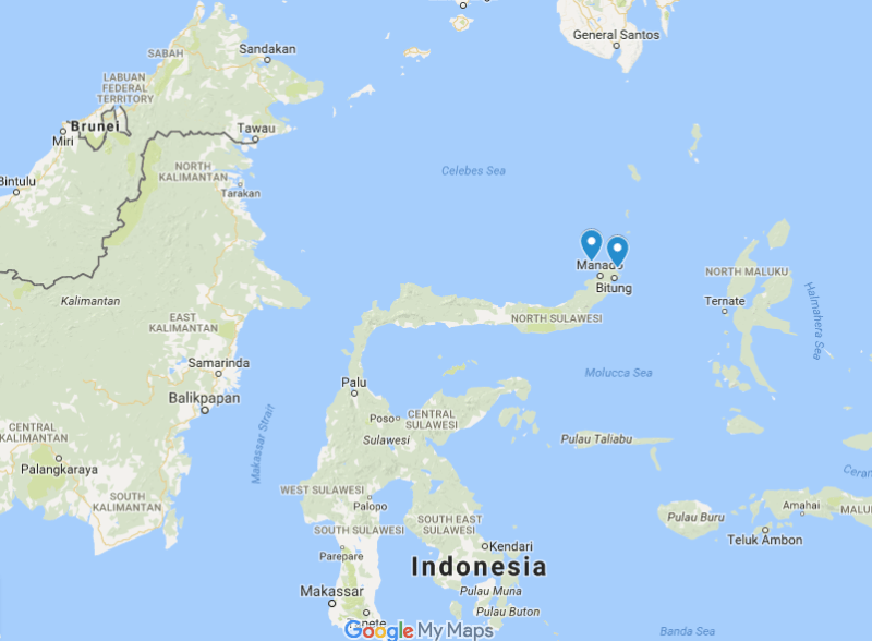 North Sulawesi with markers on Bunaken National Park and Tangkoko National Park