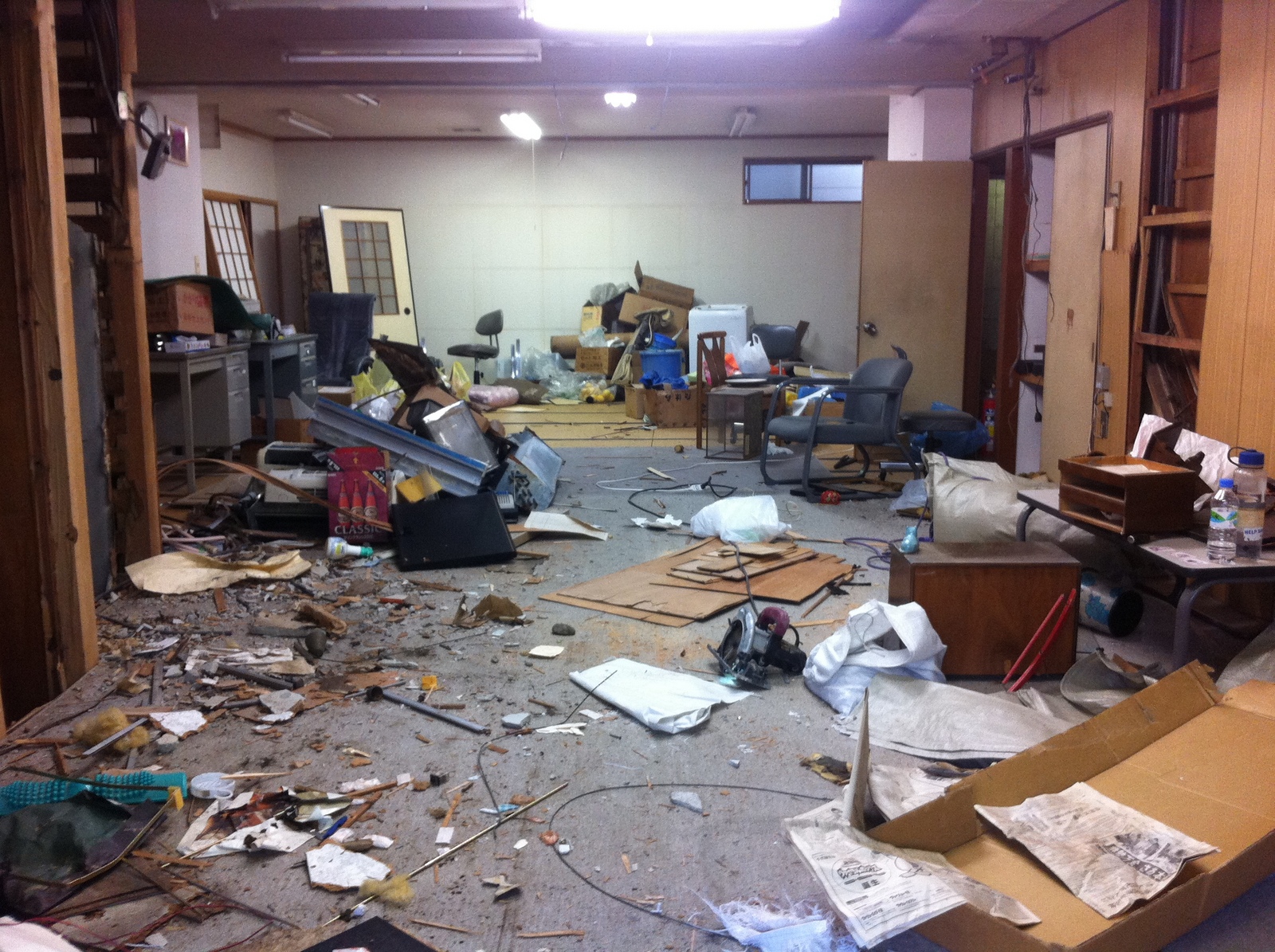 Ground floor interior before we cleared out the left over junk, pulled down the ceiling, and cleared out the rest of the lift.