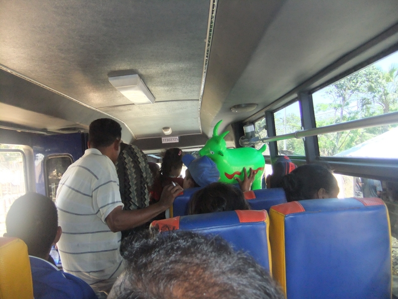 But, after a 4 days spent getting acquainted with Dili and an array of backpackers, conservationists and locals I managed to piece together the rudiments of the route to the hamlet of Com. The journey took the better part of two days, 2 over-packed busses and a 3 hour ride in the back of a flat bed truck. The buses both had seats for 19 passengers but managed to pack in more than 30 with people on the roof and hanging out the doors. On the second bus, I had the pleasure of standing on a 1 square food spot near the rear door surrounded by chain smokers and a family with a neon-green, life-size inflatable goat with truly demonic eyes.