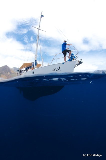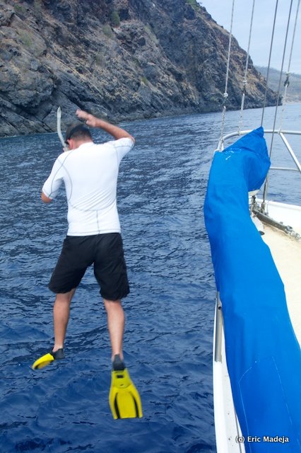 We kept probing deeper and deeper into the channel. Eric was on the mast scouting the channel ahead and I was on the bow relaying directions to Hans and watching for close rocks and coral heads. The straight kept narrowing down to less than 30 meters wide and then opening up into wide lagoons chock full of seaweed lines floating on the surface.