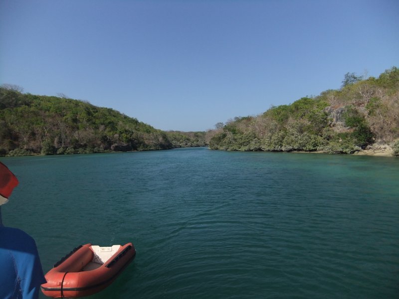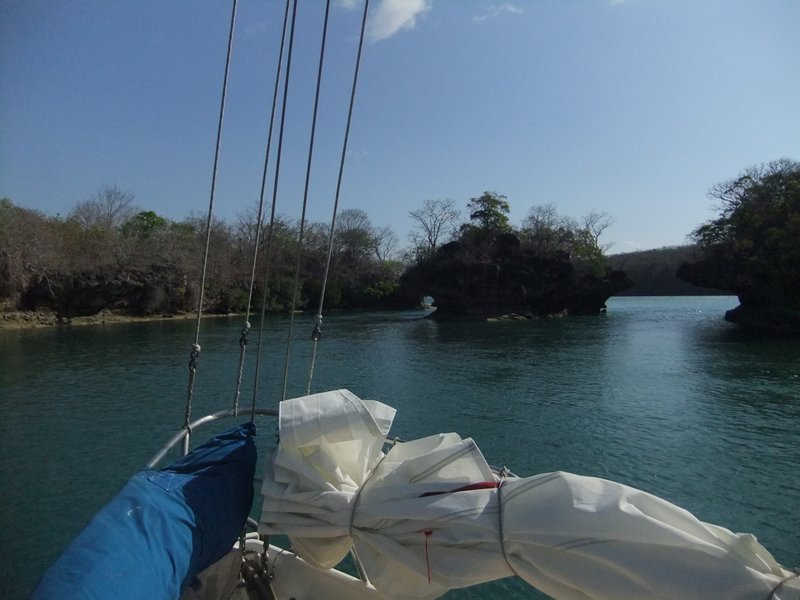 We kept probing deeper and deeper into the channel. Eric was on the mast scouting the channel ahead and I was on the bow relaying directions to Hans and watching for close rocks and coral heads. The straight kept narrowing down to less than 30 meters wide and then opening up into wide lagoons chock full of seaweed lines floating on the surface.